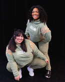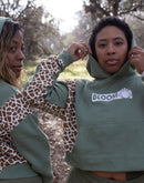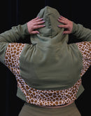This warm and cozy cropped hoodie is the perfect grab and go for those busy mornings and more. The olive green and giraffe print shell is a vibe all on its own.